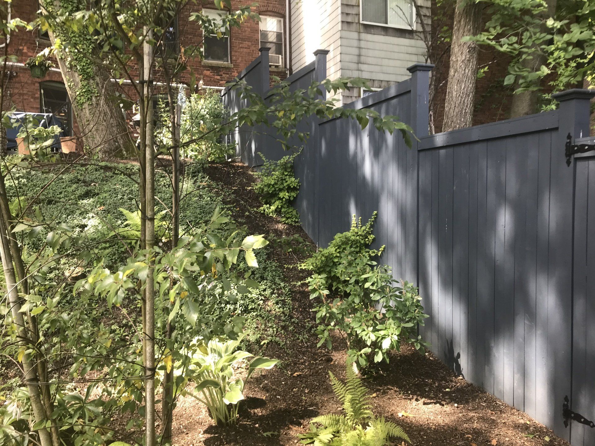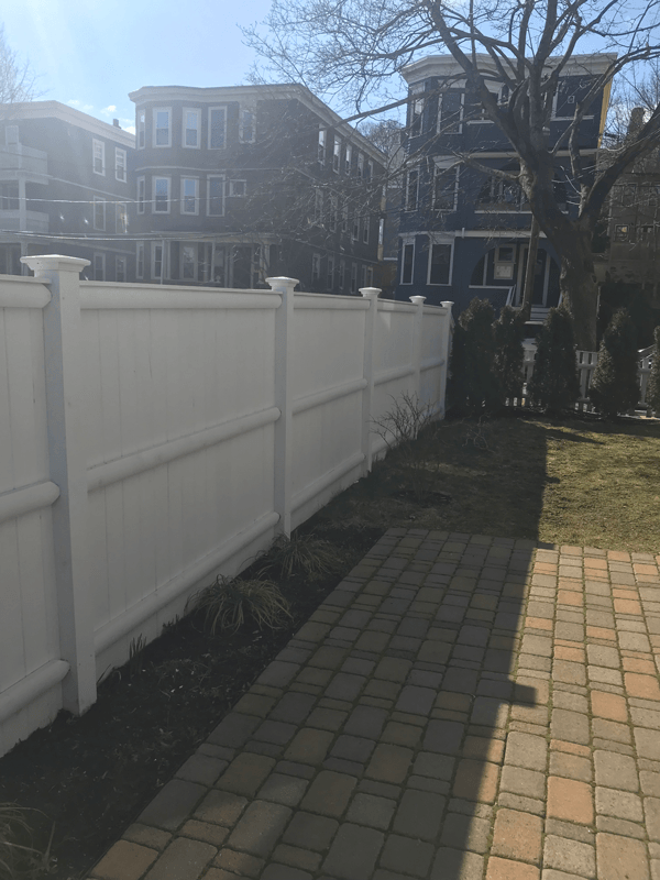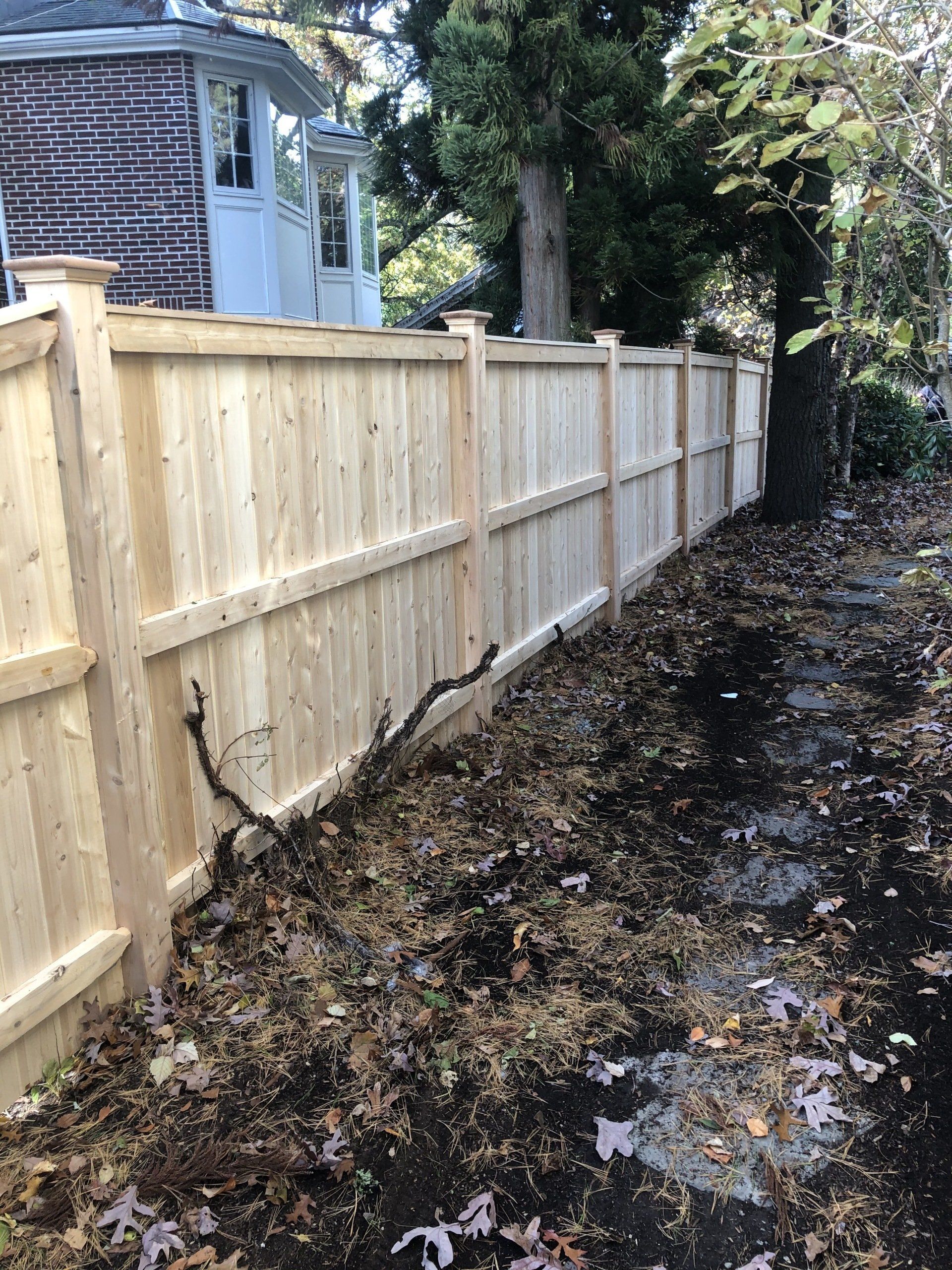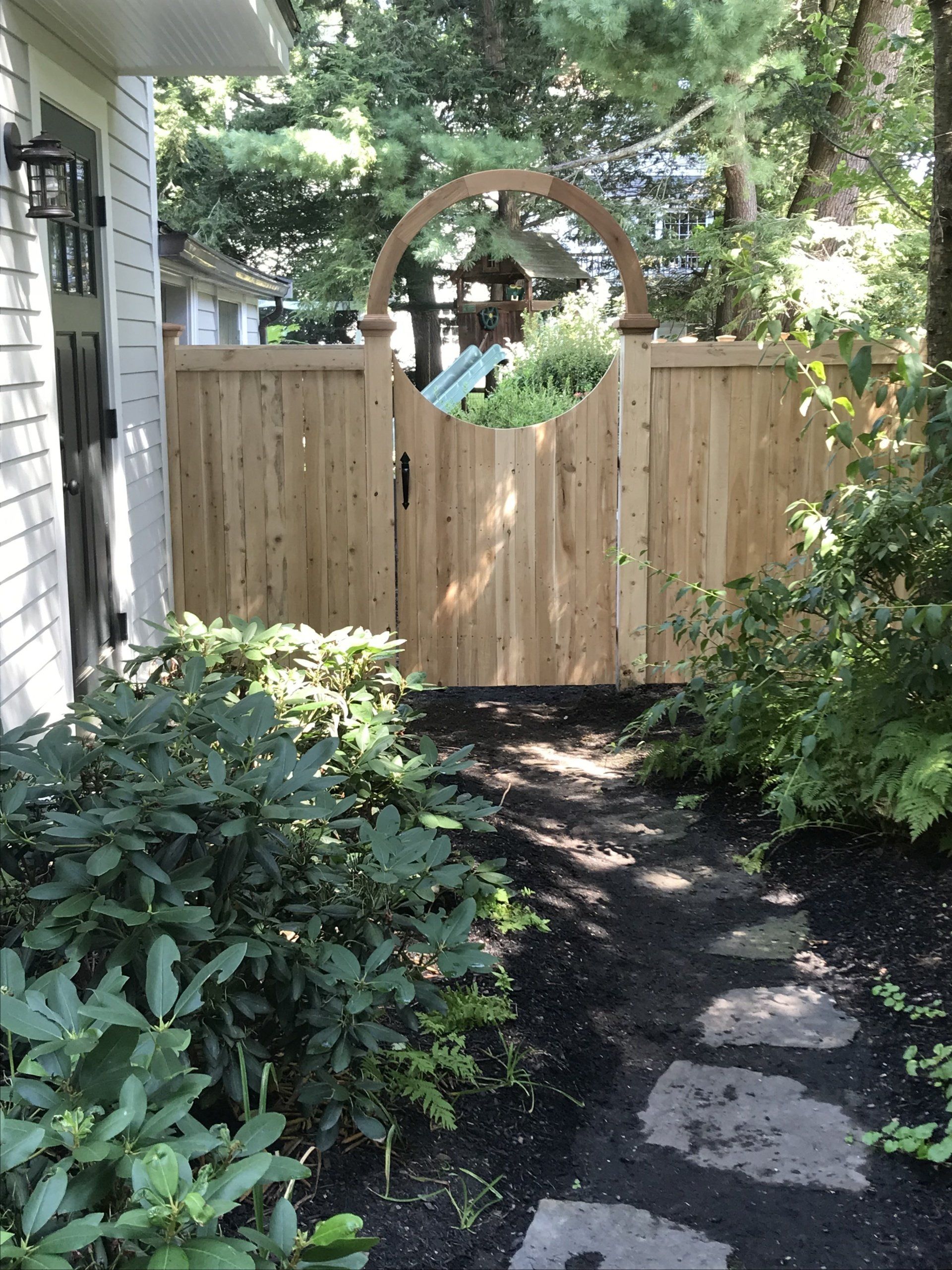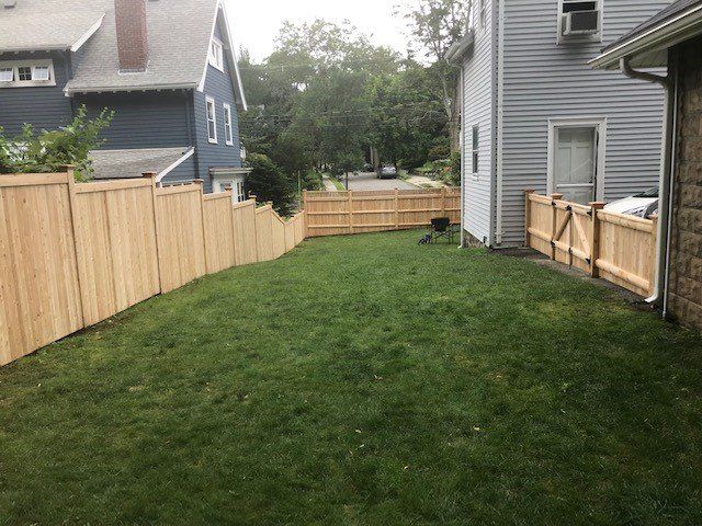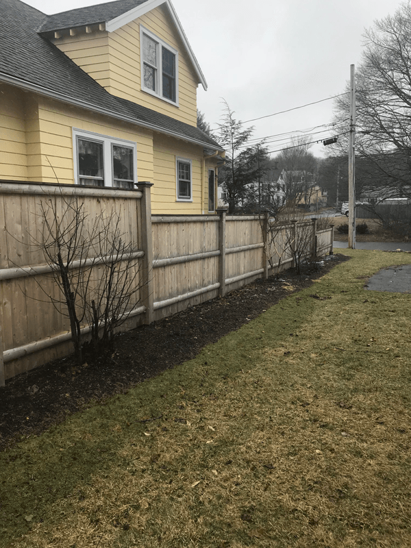 The commanding presence of our Merrimack privacy fence is a solid addition to any formal landscape. Constructed with 1x4 butted or 1x6 tongue and groove cedar boards on 2x4 cedar rails and finished with 1x4 cedar fascia and cap.