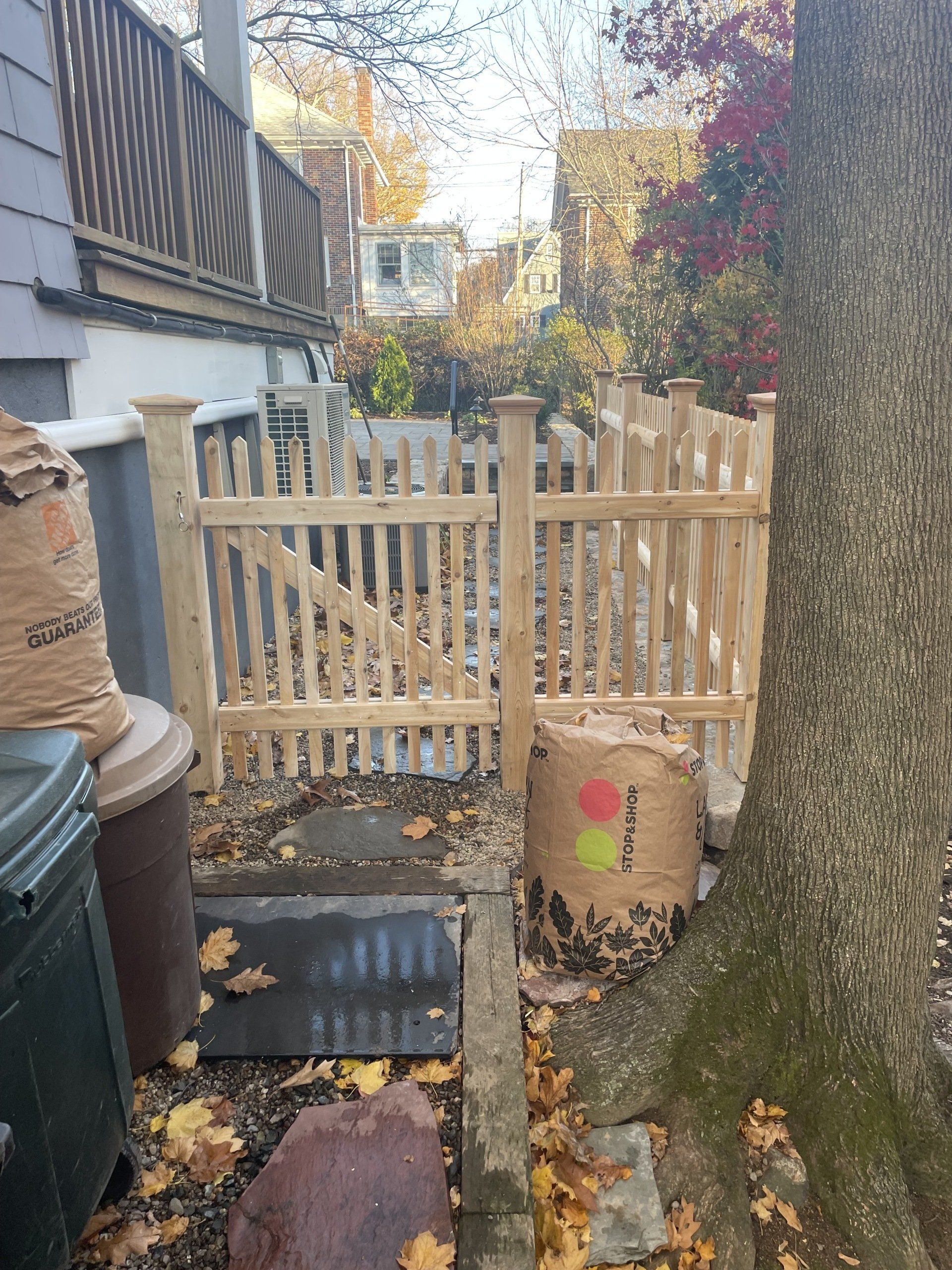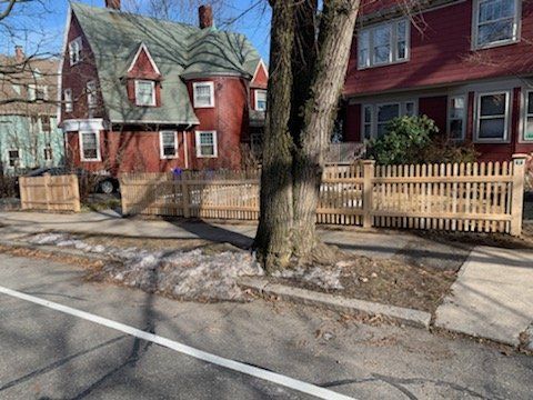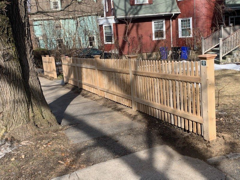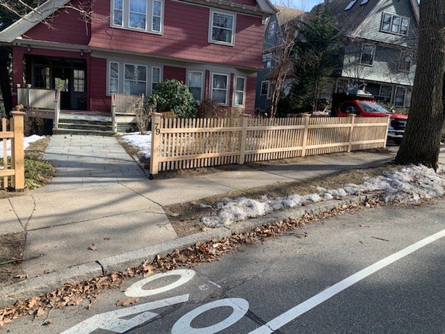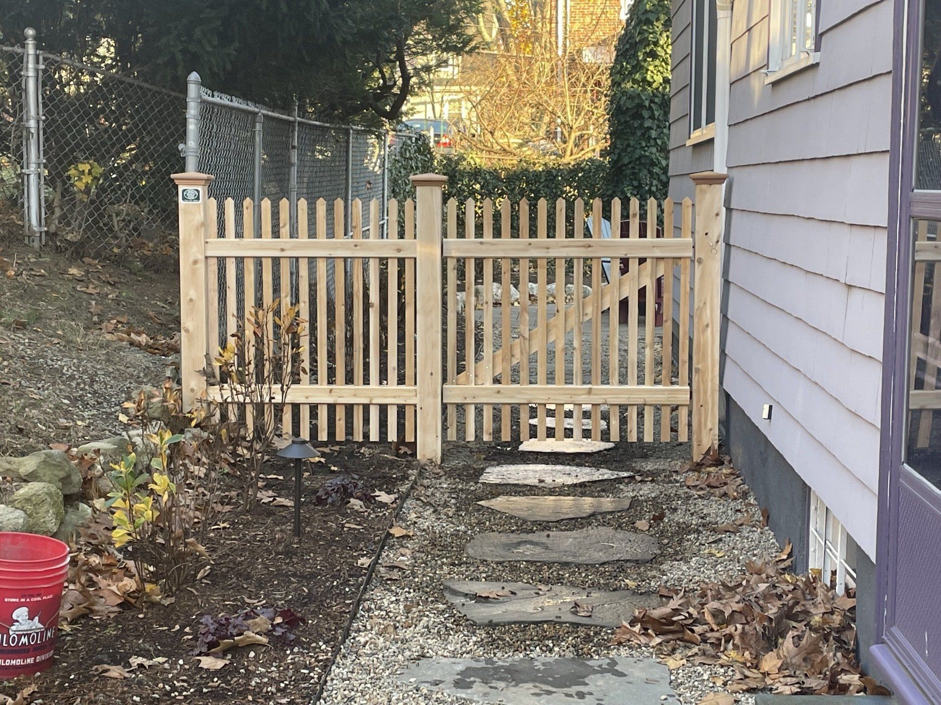 Our Penobscot is classic in its simplicity and creates stunning curb appeal. It is comprised of 1x2 pointed flat cedar pickets sandwiched between 2x4 and detailed 1x4 Cedar trim boards.